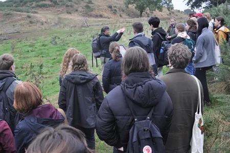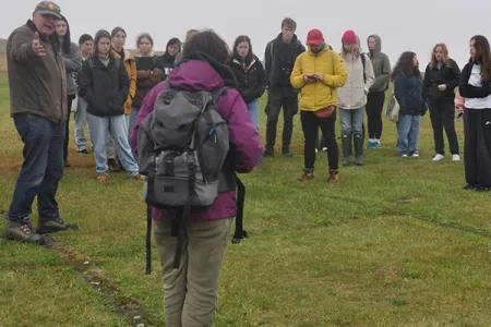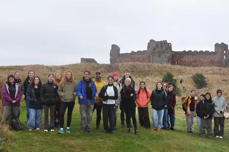 Dr Henry (Indiana) Jones Jr once said, “If you wanna be a good archaeologist you gotta get out of the library!", which is exactly what some of our first year archaeology students did recently. The School of History, Classics and Archaeology is lucky enough to have a wealth of archaeological sites on its doorstep. A group of first year archaeology students led by Dr Guillaume Robin (Archaeology Teaching Director) and Dr Tanja Romankiewicz (Lecturer in Prehistoric and Roman Archaeology) recently toured East Lothian, taking in a range of sites covering thousands of years.The group first visited Chesters Hill Fort, an Iron Age hill fort, probably built in the first millennium BC, and which was occupied into the Roman occupation of Britain in the early centuries of the first millennium AD. The site has never been excavated but the remains of several houses are still visible. Dr Tanja Romankiewicz explains features in the landscape around the group of students. Next on the itinerary was Doon Hill, an Early Neolithic settlement site (c. 3700 BC). In the 1960s the site was excavated but was thought to be Early Medieval! Further research and new radiocarbon dating have recently demonstrated its Neolithic date. A special guest joined the group at Doon Hill, Professor Ian Ralston (Abercromby Emeritus Professor of Archaeology). Professor Ralston - an expert in hillforts - has a history with Doon Hill, having first excavated there a schoolboy and returned to it following his retirement, being instrumental in uncovering the evidence of the true date of the site. Professor Ian Ralston - in baseball cap at left - at Doon Hill. And last, but definitely not least, was a trip to Tantallon Castle, a grand Medieval castle built on a sea cliff edge. Built in the mid-14th century, it was besieged several times over the centuries, finally by Oliver’s Cromwell’s invasion of Scotland in 1651. It's a popular filming location, featuring in everything from sci-fi movie 'Under the Skin', starring Scarlett Johansson, to 'Kuch Kuch Hota Hai', a Bollywood romantic comedy. Archaeology students at Tantallon Castle. You can find out more about our archaeology degrees, Drs Robin and Romankiewicz, as well as Professor Ralston's work at the links below. More information Find out more about sites and people mentioned in the article. Undergraduate archaeology degrees Dr Guillaume Robin's staff profile Dr Tanja Romankiewicz's staff profile Professor Ian Ralston's staff profile Find out more about the sites Atlas of Hillforts of Britain and Ireland Publication date 14 Oct, 2024